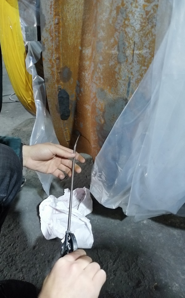 客戶現場的大腔體容器容積為2 m3,漏率要求為6.9*10-10Pa.m3/s。因為工件漏率要求很高,所以要求工件內部要抽得足夠幹淨,所以91香蕉视频污污污建議客戶配置分子泵組作為輔抽泵,同時配置真空計檢測腔體真空度。香蕉视频APP网站連接在分子泵的排氣口和機械泵的進氣口之間。泵組與容器上焊接的KF40法蘭直接相連,先開機械泵對容器腔體抽真空,當真空度達到10Pa時開啟分子泵。經過大約一個半小時的抽空,容器腔體內真空度達到了0.5Pa,此時打開檢漏儀檢漏口的真空擋板閥,測得係統本底值為5.0*10-10Pa.m3/s,即可以進行噴氦檢漏。91香蕉视频污污污由近及遠,由上到下,在法蘭連接及焊縫處等可疑漏點噴吹少量氦氣,觀察檢漏儀的讀數是否上升,來查找漏點並進行封堵。待查完漏點後,再用薄膜將容器整體包裹住,向薄膜內充一定濃度的氦氣,可通過氦氣濃度儀來判斷充入氦氣的濃度。觀察檢漏儀穩定後的讀數,即可判斷工件整體漏率是否合格。