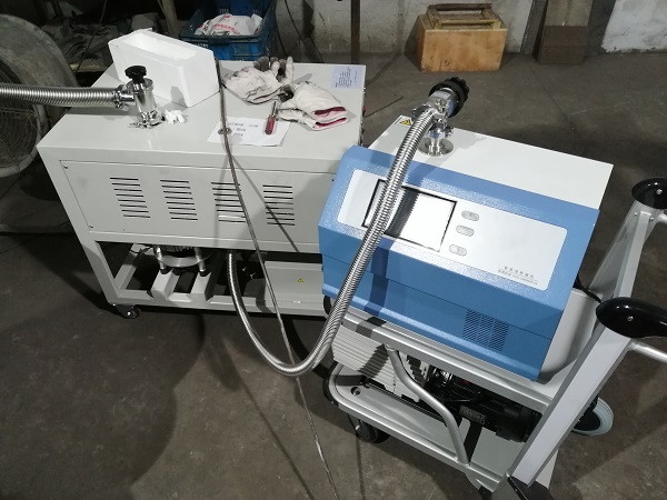 當容器的體積比較大,且需要進行真空檢漏時,就需要使用香蕉视频APP网站搭配輔抽泵組一起來完成容器的內腔體泄漏檢測。具體實施過程是將輔抽泵組與被檢的容器連接後,通過泵組將腔體內部抽到一定的真空度,然後開啟檢漏儀,通過對容器表麵可疑泄漏處(通常是焊縫、法蘭連接等)噴吹氦氣,觀察檢漏儀的讀數,來尋找泄漏點。